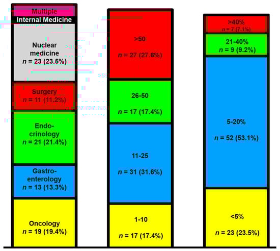 A total of 98 participants took part in the survey, and 75.5% (n = 74) of the participants answered all the questions completely. Most physicians worked in a university hospital (71.4%, n = 70), followed by non-university hospitals (16.3%, n = 16) and specialist practices (7.2%, n = 7). The question of clinical specialization was answered as follows: oncology (19.4%, n = 19), endocrinology (21.4%, n = 21), gastroenterology (13.3%, n = 13), surgery (11.2%, n = 11), nuclear medicine (23.5%, n = 23), and internists (2%, n = 2) (Figure 1, left column).