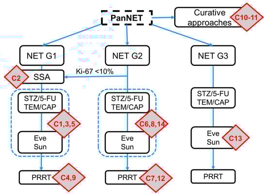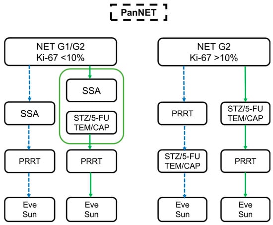 As predictive markers for the treatment choices are not available, the recommendations for systemic therapies are based on the proliferative capacity of the disease (measured in Ki-67), the extent of metastasis, tumor-related symptoms, functionality, and patient-specific comorbidities []. While there is a well-established treatment algorithm consisting of SSA-PRRT-targeted therapy (+/−locoregional therapy) for patients with small bowel NET, the situation in pancreatic NETs is more complex and more heterogeneous [].