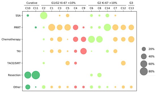 Treatment strategies in pancreatic NET (PanNET) cases. The selection of therapy based on the scenarios: curative, NET G1/G2 Ki-67 < 10%, NET G2 Ki-67 > 10%, and NET G3. The questions are grouped by first- to third-line therapies: the first-line questions C2, C6, C8, and C14 are marked in green; the second-line questions C1, C3, C5, C7, C12, and C13 are marked in orange; and the third-line questions C4 and C9 are marked in red. The size of the points reflects the percentage per case report. SSA = somatostatin analogs; PRRT = peptide receptor radionuclide therapy; tyrosine-kinase inhibitors (TKI) = everolimus and sunitinib; Chemotherapy = 5-FU/streptozotocin-containing (STZ) or temozolomide and capecitabine; and Other = watch and wait, combined approaches, or other not specified.