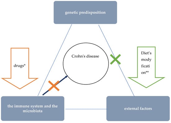 The etiology of CD is unknown. Currently, interactions between environmental factors and the intestinal microflora and immune system (intestinal barrier) in individuals with a genetic predisposition to develop the disease are considered the most likely pathomechanism (Figure 1) [20]. The critical importance of environmental factors is confirmed by epidemiological data, including incidence rates around the world. Interesting information was provided by observations among people who moved from regions with low incidence to countries with high incidence—it was shown that the offspring of immigrants had the same risk of CD as children coming from families living in regions with high incidence for many generations [21]. One of the best-studied environmental factors in the context of CD pathogenesis is diet. Recent data suggest that as a result of specific dietary factors, the delicate immune balance between the microbiota and the intestinal mucosa is disrupted, leading to chronic inflammation. This hypothesis is supported by research findings that show a correlation between the so-called Western (industrialised) dietary pattern and increased risk of CD [6,9,10].