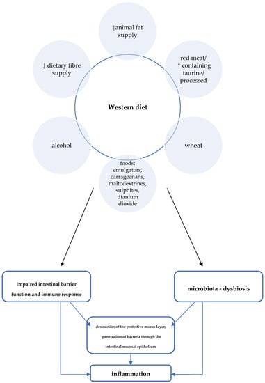 A summary of Western dietary factors considered as particularly important in the pathomechanism of inflammation in CD is shown in Figure 2.