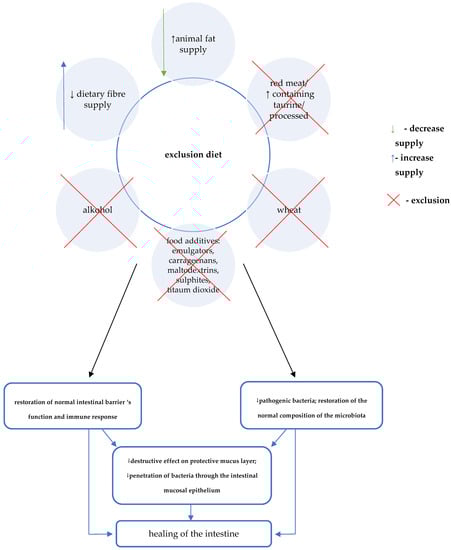 The direct effect of the elimination diet on restoring eubiosis, normal intestinal barrier function, and immune response, causes the quenching of inflammation and healing of the intestinal mucosa (Figure 3).