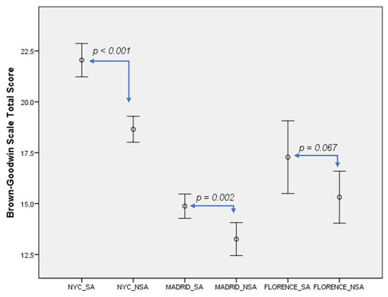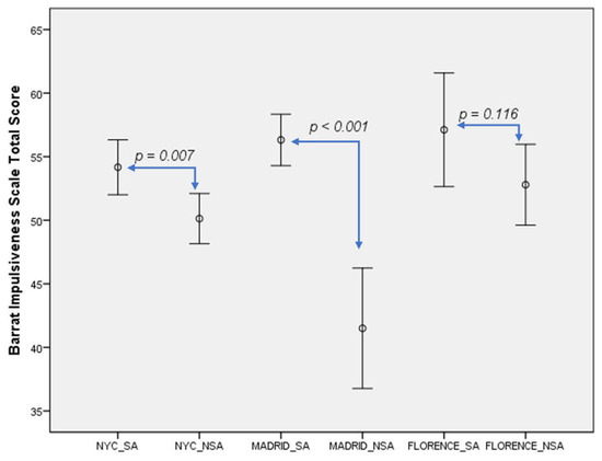 With regard to impulsivity, the mean BIS score was higher in the Florence sample (55.0 ± 9.7) than in Madrid (53.2 ± 20.1) or NYC (52.0 ± 16.6), although these differences were non-significant.