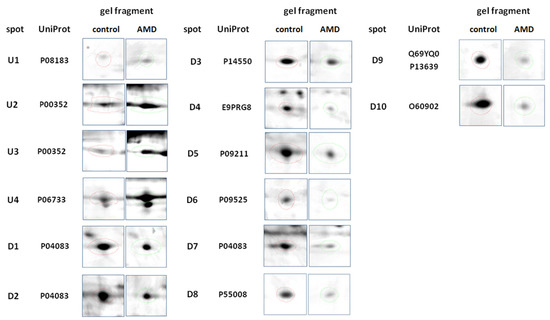 Representative 2DE gel spots of significantly (p ≤ 0.05) differentially expressed proteins in Table 2. D software (version 4.7, DECODON, Greifswald, Germany). Left column represents the control group, and the right column represents the AMD group.