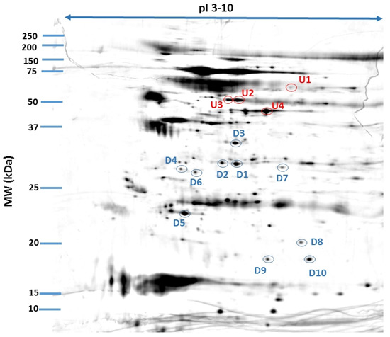 Fused image showing the condensed spot patterns from the experiment. The differentially expressed proteins in the neovascular AMD group versus the control group are marked. Upregulated proteins are indicated in red, and downregulated proteins are indicated in blue. The proteins were separated in the first dimension by isoelectric focusing over an isoelectric point (pI) range of 3–10. The second dimension was performed using 12.5% SDS polyacrylamide gels. The gels were silver stained, digitized, and processed in Delta2D software (version 4.7, DECODON).