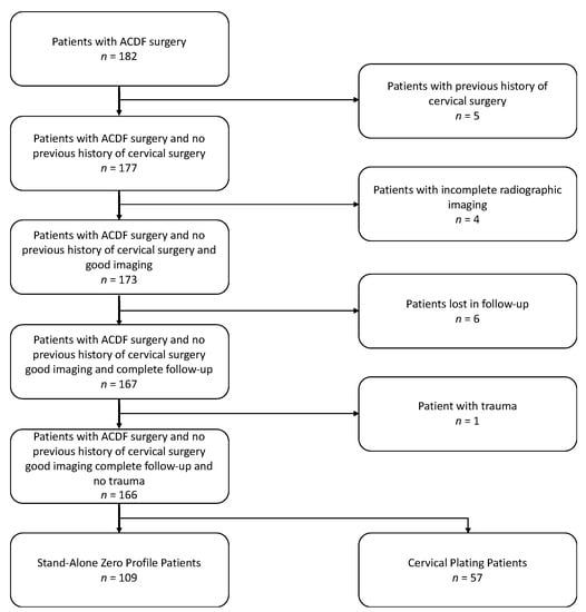 Between January 2013 to December 2016, a total of 182 patients underwent single to three-level ACDF in the Department of Neurosurgery at Yale New Haven Hospital, New Haven, CT, USA. Of the 182 patients, we retrospectively reviewed 166 consecutive patients that had received ACDF (Figure 2). Yale University’s IRB approved the protocol for this study (protocol number 200020713), and the study was exempt from informed consent. Inclusion criteria included: signs and symptoms of cervical radiculopathy, myelopathy, or myeloradiculopathy, unresponsiveness to conservative measures, ages between 18–85, and disc herniation identified by MRI with evidence of nerve root and/or cord compression. Exclusion criteria included: patients presenting with ossification of the posterior longitudinal ligament, a history of malignancy, evidence of systemic or local infection, history of cervical spine trauma, prior cervical spine surgery, and patients requiring simultaneous anterior and posterior surgery. Demographic information, medical comorbidities, selected medications and selected personal history were also collected.