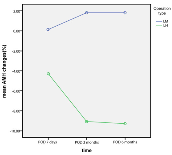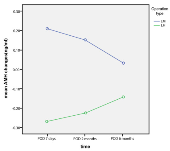 In addition, AMH changes at 7 days postoperatively from the baseline level were significantly decreased in the LH group compared to those in the LM group (p = 0.042). However, AMH changes at 2 months and 6 months postoperatively, compared to the baseline level, were not different between the two groups (p = 0.053 and 0.752, respectively). Percentage changes in AMH from the baseline level at 7 days, 2 months, and 6 months postoperatively were not different between the two groups (p = 0.576, 0.312, and 0.522, respectively). Moreover, the significant decrease in AMH (more than 60% decrease from the baseline level) was not different at 7 days, 2 months, and 6 months postoperatively between the two groups (p = 0.415, 487, and 0.364, respectively).