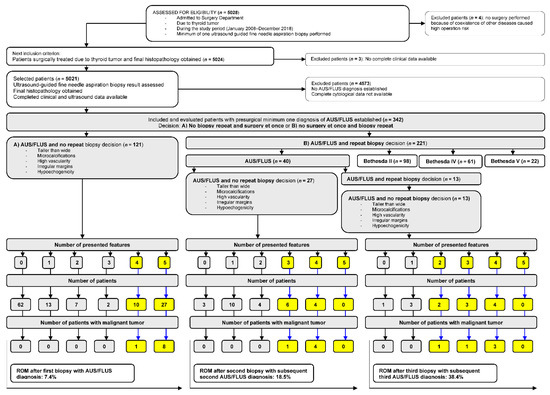 The steps for patient selection are presented in Figure 1. From the initial group of patients (n = 5028), we extracted data from 342 (6.8%) patients with AUS/FLUS diagnosis. In each of the medical records of these individuals, we evaluated the numbers and diagnosis of all biopsies performed during the observational study time. All patients were qualified to UG-FNAB in accordance with American Thyroid Association Management Guidelines for Adults Patients with Thyroid Nodules and Differentiated Thyroid Cancer [2]. All US examinations were performed by two radiologists with a minimum of 10 years of experience in thyroid ultrasonography. All US features of all TNs of every single patient were accurately described and introduced into the medical data base formed for this study. We evaluated five ultrasound (US) features of TNs with AUS/FLUS diagnosis (microcalcifications, hypoechogenicity, irregular margins, taller-than-wide shape, and high vascularity defined as intranodular flow with multiple vascular poles chaotically arranged) and compared them with the final histopathological diagnosis.