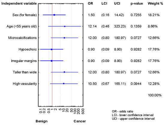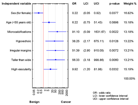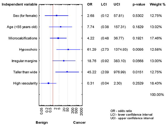Multiple logistic regression analyses demonstrated significantly higher rates of microcalcifications, hypoechogenicity, irregular margins, and taller-than-wide shape in patients with TN malignancy than in patients with benign disease (p < 0.0001 for all). In addition, the age below 55 years old was also a significant risk factor for cancer presence (p = 0.044). The probability of nodule size < 2 cm was 100% for patients with TN malignancy and logistic regression analysis for this variable was not performed.