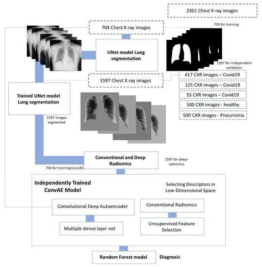 The resulting U-Net to segment the lung area and ConvAE to extract CNN-based radiomics were subsequently evaluated in terms of the ability to diagnose COVID-19 versus healthy and pneumonia patients.