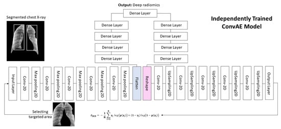 In this study, a deep convolutional autoencoder modified with dense layers was used. Several initial layers are convolutional layers with 3 × 3 filter size and dense layers to convert the input images to latent space and extract the representation code of the input [52,55]. Such a stacked autoencoder encodes the input CXR image into compressed latent space radiomics, also known as code, within the lower-dimensional space. With these codes, the autoencoder reconstructs the original input similar to decoder path modules [56,57]. The proposed architecture carries out the self-learning representations from CXR images and analyzes the latent space-compressed radiomic features in terms of their discriminative capacity. By training the autoencoder, the model learns how to reconstruct the compact representation of input data.