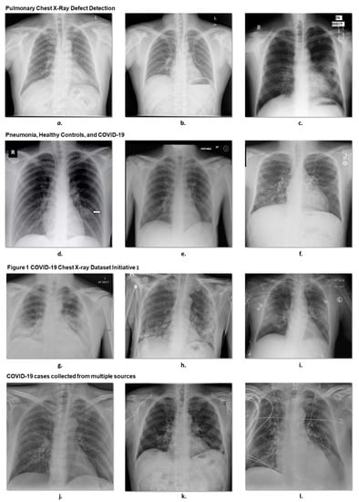 In total, 417 frontal chest X-rays of COVID-19 cases were selected from the dataset, 761 images with 679 frontal chest and 82 lateral views. Of the 679 frontal images, 518 were standard frontal posteroanterior–anteroposterior (PA/AP) views, and 161 were AP laying down supine all of which were collected from different hospitals across 26 countries. In total, there were 468 COVID-19 (SARSr-CoV-2), 16 SARS (SARSr-CoV-1), 10 MERS-CoV, 5 Varicella, 4 Influenza, 3 Herpes viral cases, 13 Streptococcus spp., 9 Klebsiella spp., 4 Escherichia coli, 4 Nocardia spp., 5 Mycoplasma spp., 7 Legionella spp., 2 Unknown, 1 Chlamydophila spp., 1 Staphylococcus spp. bacterial cases, 24 Pneumocystis spp., 2 Aspergillosis spp. fungal cases, 8 Lipoid, 1 Aspiration, and 59 unknown cases in the age of 20 to 90 years old [71,72,73,74,75,76,77,78,79,80] (Figure 3j–l).