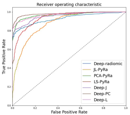 The receiver operating characteristic (ROC) curves for deep radiomics and compressed conventional radiomics using JL, LS, and PCA, and a combination of both deep and conventional radiomics are shown.