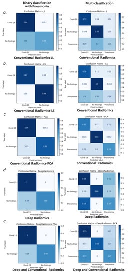 JL radiomics showed the lowest binary-class classification accuracy 79.3% (77.2–80.3%) to detect COVID-19 versus other cases. This might be due to spanning features onto a lower-dimensional space that preserves the Euclidean distance between features but not selecting the most effective radiomics, increasing the accuracy of classification. This trend is also observed in multiclass classification and JL 63.9% (62.5–65.2%), which showed the lowest classification accuracy after deep radiomics, 63.5% (61.3–65.1%). PCA alone showed the highest accuracy for both binary 89.6 (88.4–90.7) and multiclass 72.6 (69.4–74.4) classification. Once combined with deep radiomics, PCA resulted in 88.8 (88.7–89.0) and 72.5 (71.2–73.4) for binary and multiclass classifications, respectively. Deep-LS showed the lowest accuracy, 66.8% (65.9–73.4%), in multiclass COVID-19 classification when both types of features are combined. We also calculated the statistical difference of the maximal accuracy (PCA) with other approaches using a two-tailed t-test (see Table 2). Deep-LS showed considerable similarity to PCA covariates (t-statistic = 1.05, p-value = 0.29), and there was a marginal statistical significance for deep-PCA (t-statistic = 2.3, p-value = 0.02). The rest of the methods showed significant statistical differences. Figure 6 shows the confusion matrices for binary- and multiclass classification of COVID-19. For binary-class classification, we stratified patients into COVID-19 cases versus “other” cases (i.e., no finding and pneumonia). Among the five groups, conventional radiomic PCA (Figure 7c—left column), deep radiomics (Figure 7d—left column), and their combination (Figure 7e—left column) showed the highest accuracy of COVID-19 detection. In multiclass classification, LS radiomics (Figure 7b—right column) and deep-radiomics-PCA (Figure 7e—right column) showed the highest accuracy of detecting COVID-19. PCA-radiomics (Figure 7c—right column) showed the highest accuracy of finding healthy and Pneumonia cases.