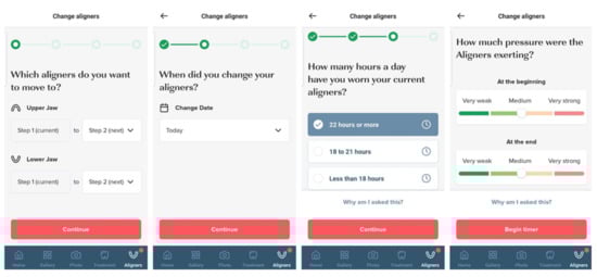 The patients were instructed to check-in every aligner change using the app-based questionnaire (Figure 1 and Figure 2) and to send a set of photos every two months for follow-up through the PlusDental mobile application. The photos, aligner change date, the subjective pressure exerted at the start and the end of the aligner wear, the aligner fit, the current position of the teeth from different angles, and self-reported aligner wear duration were assessed by a dental practitioner, who then instructed the patient to continue the treatment, wear an aligner for a longer duration or repeat a step when necessary. Other comments concerning the treatment, or the oral health condition of the patient were communicated as well. At the end of the treatment process, the aligner fit, and the tooth position compared with the virtual treatment plan as well as patients’ satisfaction were assessed.