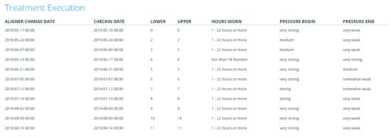 A retrospective cohort study was conducted using anonymized data provided by PlusDental, a brand of the Sunshine Smile GmbH (Berlin, Germany). PlusDental is a Berlin-based health-tech company, specializing in the digitalization of dental treatments and operating a digital dental care platform for aesthetic orthodontic tooth corrections, with a network of more than 200 local partner dentists. The platform integrates laboratory manufacturing of orthodontic aligners as well as treatment monitoring elements enabling dentists or orthodontists to monitor aligner changes of patients and aligner pressure using a standardized questionnaire. Among other data, this information is evaluated by the dentist or orthodontist bimonthly, and patients are provided feedback and individual instructions on wearing duration, change interval, aligner handling, or oral hygiene by e-mail or telephone.