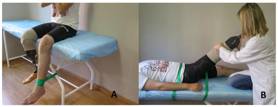 To record the MVC of the quadriceps, the participants were seated on a stretcher with a hip flexion of 90° so that their feet were not in contact with the ground during the voluntary muscle activation tests. These were secured to the stretcher by means of pole therapy straps, to avoid movements and compensation for effort by another muscle group (Figure 3A). To obtain MVC of the hamstring group, a stretch based on the proprioceptive neuromuscular facilitation technique was chosen. The therapist took up a cranial and ipsilateral position with respect to the participant’s limb to be stretched, with one leg flexed on the stretcher. The individual was placed in supine position, flexing the hip of the limb to be stretched, keeping the knee extended and the leg on the therapist’s shoulder. The other limb was extended on the table. The therapist flexed the participant’s hip until he/she reported tension in the hamstring. The subject was then asked to carry out an isometric quadriceps contraction resisted by the therapist’s hand for three seconds. The subject then relaxed the leg for two seconds, and afterwards the therapist performed a maximal hamstring stretch for 10 s [26,27] (Figure 3B).