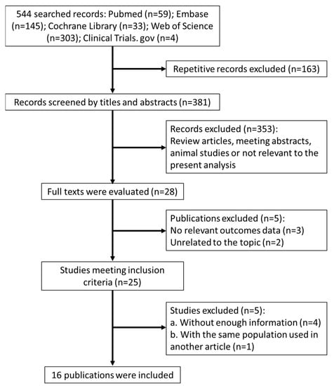 The search process and study selection (presented in Figure 1) identified 544 records of interest. Among these, 163 were excluded for being repetitive, and 353 additional articles were excluded from the analysis because they were review articles, published protocols, lab studies, animal studies, or articles deemed not to be of relevance based on their titles and abstracts. The full texts of the 28 remaining articles were obtained. Several studies were subsequently excluded because they did not meet the predefined inclusion criteria, including those with no relevant outcome data (three articles) and those reporting on unrelated topics (two articles). Four studies were excluded due to insufficient information pertaining to the inclusion criteria, and a second article by the same authors was found to be a repetitive report based on a partial dataset. In total, 16 publications, reporting on 16 cohort studies, were selected for inclusion in the analysis [11,12,13,14,15,16,17,18,19,20,21,22,23,24,25,26].