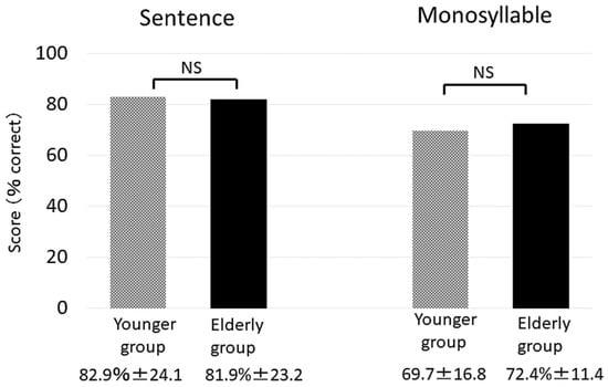 There was no significant difference in the preoperative pure-tone average and maximum discrimination score between the two groups. Figure 1 shows the postoperative speech recognition results obtained in a quiet environment. In the postoperative period, the mean sentence recognition score was 82.9% ± 24.1 in the younger group and 81.9% ± 23.1 in the elderly group; the respective mean monosyllable recognition scores were 69.7% ± 16.8 and 73.9% ± 20.2, respectively. There was no significant difference in sentence and monosyllable recognition scores between the two groups. The sentence recognition score in each patient was not correlated with age at implantation.