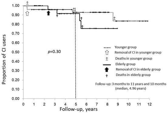 Changes in the percentage of patients who were alive and continued to use their CI over time (referred to as CI users here) are shown as a Kaplan–Meier curve in Figure 2. A log-rank test showed no significant difference in the percentage of CI users over time between the two groups. Based on the median postoperative observation period for all 81 patients of about five years, CI users at five years after surgery amounted to 92.8% of the younger group and 91.5% of the elderly group.