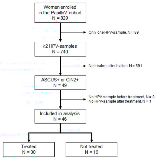 Over the median follow-up of 34.9 months (32.0 to 36.8) and the 2073 women-months of follow-up, 49 women had cervical lesions fulfilling treatment indication. Three of them were excluded from the analysis because of missing HPV samples either before or after treatment. The median duration between the initial and final HPV sample was 24.4 months [19.5 to 35.1]. Figure 1 describes the flow chart of women selection for this analysis.