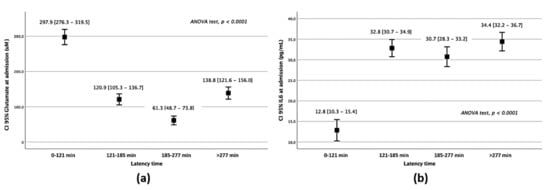 An initial descriptive analysis was performed. Significant variables were added to a multivariate regression model. Results were defined as percentages for categorical variables and as mean ± standard deviation (SD) or median and range (25th–75th percentiles) for continuous variables depending on whether their distribution was normal or not. Kolmogorov–Smirnov test was applied to assess normality. Then, statistical inference was carried out with the chi-square test, ANOVA or H of Kruskal–Wallis according to the nature of the contrast variable and its adjustment to normality. Bivariate correlations were performed using Pearson’s or Spearman coefficients. Cut-off points were calculated in the variables of interest with a COX regression. Results were shown as odds ratios (ORs) with 95% confidence intervals (CI 95%) after a logistic regression analysis where latency time was defined as the dependent variable. p-value < 0.05 was considered to be statistically significant in all tests. The statistical analyses were conducted in SPSS 21.0 (IBM, Armonk, NY, USA).