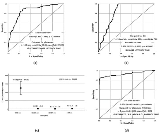Glutamate and IL-6 showed an opposite profile in Q1 suggesting that the combination of both markers may be a strong indicator of early symptoms. Based on this, we analyzed the Glutamate/IL-6 ratio in a univariate analysis for the different quartiles (ANOVA test p < 0.0001) showing a strong relationship with early latency times (Figure 2c). In light of the differences found, we analyzed its relevance as a discriminative factor through the elaboration of an ROC curve in the Q1 patients. The results showed that those patients with a Glutamate/IL-6 index on admission of >5 were associated with a latency time < 121 min from the onset of symptoms with a sensitivity of 88% and with a specificity of 80% (Figure 2d).