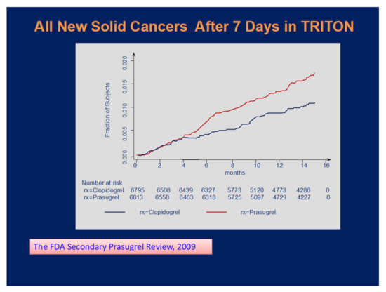 - Serebruany, V.L. Platelet Inhibition with Prasugrel and Increased Cancer Risks: Potential Causes and Implications. Am. J. Med. 2009, 122, 407–408. [Google Scholar] [CrossRef] [PubMed]