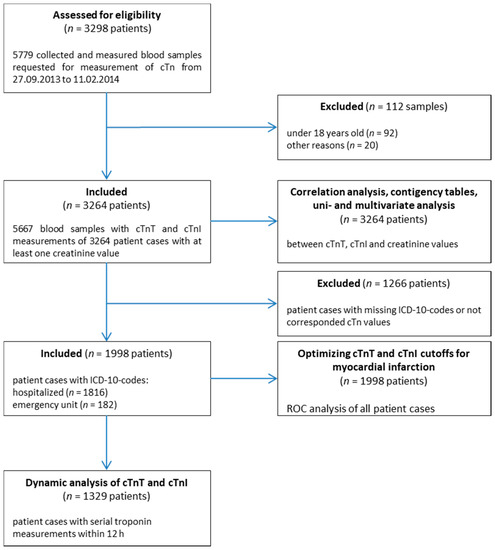 The differences between cTnT and cTnI should be worked out in a direct retrospective comparison. For this purpose, both cTnT and cTnI were measured promptly in all blood samples for which a troponin measurement was requested from the attending physician in the period from 27 September 2013 to 11 February 2014 in the central laboratory of the University Medical Center Göttingen (UMG). A total of 5779 samples were processed in this way (Figure 1). A total of 112 samples were excluded from the study due to technical failure (missing data transmission, no correct measurements, too little sample volume, etc.) or patients being under the age of 18 years (n = 92). The remaining 5667 sample results were included in the study and statistically analyzed. At least one creatinine value was recorded for each patient case (n = 3264) at the same time, when cTn was measured. The statistical analyses were either sample-related or patient-specific. For the ROC (receiver operating characteristic) analyzes, the ICD-10 (international statistical classification of diseases and related health problems) codes of the main diagnoses of the patient cases, available in the hospital accounting, were used. A total of 1266 patient cases could not be used due to the lack of any diagnostic data in our system. However, 1998 patient cases (1816 hospitalized, 182 from the emergency unit) could be used for the ROC analyzes. There were 1329 patient cases with an available diagnosis and at least two troponin measurements within 12 h that could be used for the dynamic analysis. The venous blood was analyzed from lithium-heparinate plasma (S-Monovette Li-Heparin, Sarstedt AG & Co., Nürnbrecht, Germany). The samples were centrifuged for 10 min at 4230 rpm at 20 °C. cTnT and cTnI were measured in succession. The study was conducted according to the World Medical Association Declaration of Helsinki and approved by the UMG Ethics Committee.
