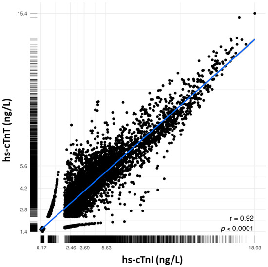 Correlation analysis between cTnT and cTnI. Scatterplot of hs-cTnT and hs-cTnI measurements in all blood samples (n = 5667). The limit of detection was set at 5 ng/L for hs-cTnT and 1.9 ng/L for hs-cTnI. The blue line is the regression line. Pearson correlation coefficient is given. Axes are log scaled.