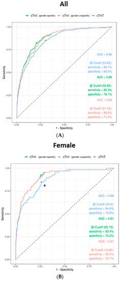 Receiver operating characteristic (ROC) analysis for cTnI and cTnT. ROC curves are shown for all patient cases ((A); n = 1998) and for female ((B); n = 806) and male ((C); n = 1192) distinctly. Analyses are based on the diagnosis of myocardial injury. Green curves are for cTnI with gender-specific cutoffs, red curves for cTnI with gender-unspecific cutoff and blue curves for cTnT. Calculated are area under the curves (AUC), optimized cutoffs (Youden Index) and sensitivities as well as specificities at the calculated cutoffs. * p < 0.05 (DeLong’s Test comparing cTnI and cTnT).