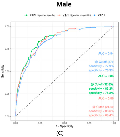In order to investigate the specificity and sensitivity of cTnT and cTnI in the diagnosis of myocardial infarction based on the main diagnoses of the patients in the study cohort, ROC analyses were carried out (Figure 3). For cTnT, highest sensitivity (85.1%) and specificity (69.5%) were determined using a cutoff of 24.65 ng/L. With a unisex cutoff of 21.45 ng/L, cTnI can achieve a sensitivity of 88.8% and a specificity of 71.3% (Figure 3A). The calculated cutoff for cTnT is significantly higher than that recommended by the manufacturer (14 ng/L). In contrast, the threshold for cTnI is close to the value determined by the manufacturer (26.2 ng/L). The AUCs are comparable (cTnT: 0.86; cTnI: 0.88). Furthermore, gender-related calculations were considered separately (Figure 3B,C): In women, cTnT with a cutoff at 24.6 ng/L showed a sensitivity of 84.8% and a specificity of 73.9%. In men, a lower sensitivity (77.9%) with a higher specificity (76.3%) at a concentration of 37 ng/L could be achieved. The AUC is higher in women (cTnT: 0.88; cTnI: 0.91) than in men (cTnT: 0.84; cTnI: 0.86). For cTnI, using a gender-independent cutoff for women of 16.85 ng/L, a sensitivity of 95.5% and a specificity of 70.7% was estimated. In contrast, men with a cutoff of 21.4 ng/L have lower specificity (68.4%) and sensitivity (88.6%) (DeLong’s test: p = 0.049). On the other hand, a gender-specific cutoff for cTnI in women (20.15 ng/L) increases the sensitivity to 92.4% and lowers the specificity to 74.2%. In men, a lower sensitivity (83.2%) and sensitivity (76.2%) at a cutoff of 32.85 ng/L could be detected (p = 0.089). Overall, it can be seen that cTn shows a higher sensitivity in women and a higher specificity in men when diagnosing myocardial infarction by using gender-dependent cutoffs. The highest results are achieved by cTnT especially with a distinctly higher cutoff than recommended by the manufacturer and especially when considering the gender differences. Overall, cTnI appears to have better specificity than cTnT, with cTnT showing better specificity in men and cTnI better sensitivity in women.