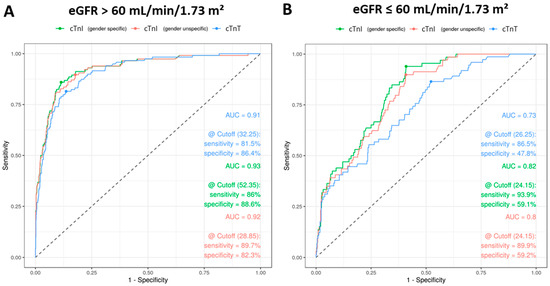 Receiver operating characteristic (ROC) analysis for cTnI and cTnT for patient cases with impaired kidney function. ROC curves are shown for all patient cases with an eGFR > 60 mL/min/1.73 m2 (A) and ≤ 60 mL/min/1.73 m2 (B) distinctly. Analyses are based on the diagnosis of myocardial injury. Green curves are for cTnI with gender-specific cutoffs, red curves for cTnI with gender-unspecific cutoff and blue curves for cTnT. Calculated are area under the curves (AUC), optimized cutoffs (Youden Index) and sensitivities as well as specificities at the calculated cutoffs.