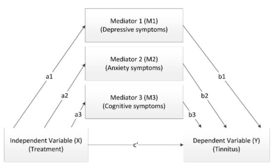 where Y is the outcome variable (change in the tinnitus score between baseline and end of treatment), X is the independent variable (treatment), Mj are the mediators (j = 1, 2, 3 change in NPI item scores and SKT total score between baseline and end of treatment), c is the total effect of the independent variable on the outcome, c’ is the coefficient relating the independent variable to the outcome (direct effect) adjusted for the effects of the mediators, ε1, ε2 and ε3j are the unexplained variances, i1, i2 and i3j are the intercepts (j = 1, 2, 3). The indirect effects can be calculated by multiplying the regression coefficients αj and βj. The combined indirect effect can be estimated by adding the indirect effects. The mediation model with three mediators is illustrated in Figure 1.
