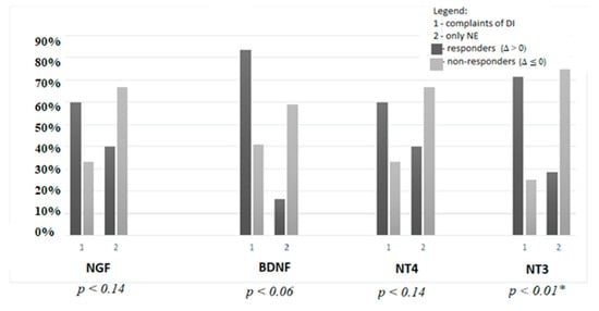 Moreover, children with complaints of daytime incontinence (DI) had a better response to TENS therapy in contrast to those presenting only with nocturnal enuresis (NE). Differences were noted in the urinary concentrations of all neurotrophins: NGF, BDNF, NT4, and NT3, but only in the case of the last one they were statistically significant (χ2 = 2.14, p = 0.14; χ2 = 3.39, p = 0.06; χ2 = 2.14, p = 0.14; χ2 = 6.47, p = 0.01, respectively), presented in detail in Figure 2.