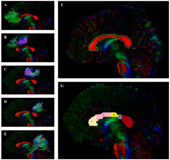 Diffusion tensor tractography of the corpus callosum (CC) with fractional anisotropy color maps (mid-sagittal plane). Green, red, and blue colors represent fibers running along the axis (anterior-posterior, left-right, and superior-inferior, respectively). Five single projections with ROIs on a sagittal plane ((A) = Region 1, (B) = Region 2, (C) = Region 3, (D) = Region 4, (E) = Region 5), (F) = whole region of CC, and (G) = all regions of CC (based on Hofer and Frahm’s [] segmentation: I = Region 1, II = Region 2, III = Region 3, IV = Region 4, V = Region 5). The methodology and segmentation scheme are discussed in our previous publication [].