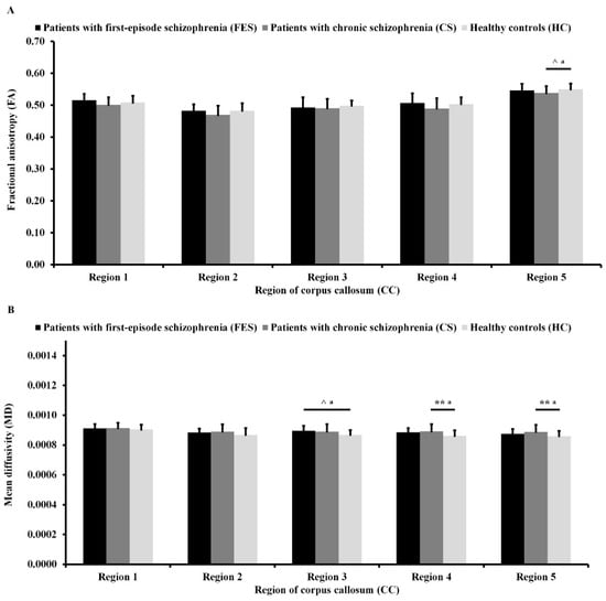 As can be seen in Figure 2B, there were significant differences in MD in Region 3 of the CC (F(2,99) = 3.53; p = 0.033; ɳ2 = 0.07), Region 4 of the CC (F(2,99) = 5.08; p = 0.008; ɳ2 = 0.09), and Region 5 of the CC (F(2,99) = 4.83; p = 0.010; ɳ2 = 0.09) between the three groups after adjusting for age. Post hoc analyses showed that patients with FES had higher MD in Region 3 of the CC (p = 0.063) than HC on the level of trend toward statistical significance. Moreover, patients with CS had higher MD in Region 4 of the CC (p = 0.006) and Region 5 of the CC (p = 0.008) than HC.
