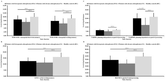 As can be seen in Figure 3A, there were significant differences in visuospatial short-term memory (F(2,99) = 18.25; p < 0.001; ɳ2 = 0.27) and in visuospatial working memory (F(2,99) = 12.38; p < 0.001; ɳ2 = 0.20) between the three groups after adjusting for age. Post hoc analyses showed that patients with FES and patients with CS had lower results in the first variable (p = 0.003 and p < 0.001) and in the second variable (p = 0.049 and p < 0.001) than HC.