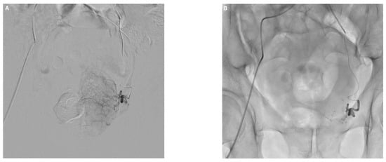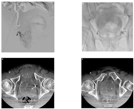 - Loffroy, R.; Pottecher, P.; Cherblanc, V.; Favelier, S.; Estivalet, L.; Koutlidis, N.; Moulin, M.; Cercueil, J.P.; Cormier, L.; Krausé, D. Current role of transcatheter arterial embolization for bladder and prostate hemorrhage. Diagn. Interv. Imaging 2014, 95, 1027–1034. [Google Scholar] [CrossRef]