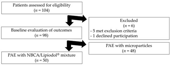 Figure 2 is the flow chart. Of the 104 consecutive patients assessed for eligibility, 6 were excluded and 48 were treated with microparticles, leaving 50 patients who underwent PAE with NBCA between November 2017 and October 2020 (Figure 2). Table 1 displays the baseline characteristics of the study patients.