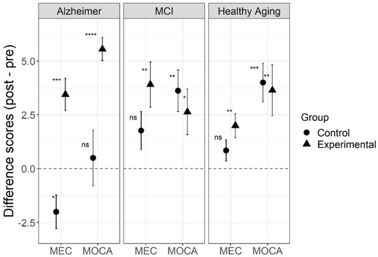 MoCA and MEC difference scores for three types of aging before and after intervention, comparing the REMPOS program (experimental group) to standard cognitive stimulation (control group). Note: Error bars indicate standard errors. Alzheimer = Alzheimer’s disease; MCI = mild cognitive impairment; MoCA = Montreal cognitive assessment; MEC = mini cognitive examination. * p < 0.05, ** p < 0.01, *** p < 0.001, **** p < 0.0001, testing a significant difference from zero.
