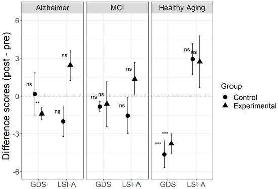 Geriatric depression scale-30 (GDS-30) and life satisfaction index-adults (LSI-A) scores for three types of aging before and after intervention, comparing the REMPOS program (experimental group) to standard cognitive stimulation (control group). Note: Error bars indicate standard errors. Alzheimer = Alzheimer’s disease; MCI = mild cognitive impairment; GDS = geriatric depression scale-30; LSI-A = life satisfaction index-adults. ** p < 0.01, *** p < 0.001, testing a significant difference from zero.