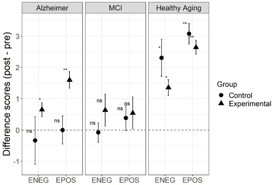 For the ENEG results, the robust two-way ANOVA for the difference scores (post minus pre) found a significant main effect of type of aging (p = 0.005), but no significant main effect of type of intervention (p = 0.902) nor a significant interaction between type of intervention and type of aging (p = 0.372). Post-hoc analyses using Wilcoxon paired sample tests found significant differences before and after intervention for the experimental (W = 88, p = 0.015) and control (W = 73, p = 0.041) groups of healthy participants, and for the experimental group with Alzheimer’s (W = 80, p = 0.049), like the results found in the EPOS scores, but the effect was much smaller in this last group. Neither the control group with Alzheimer’s nor the experimental or control groups with MCI showed significant differences after the intervention (ps > 0.993).