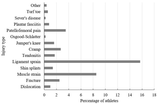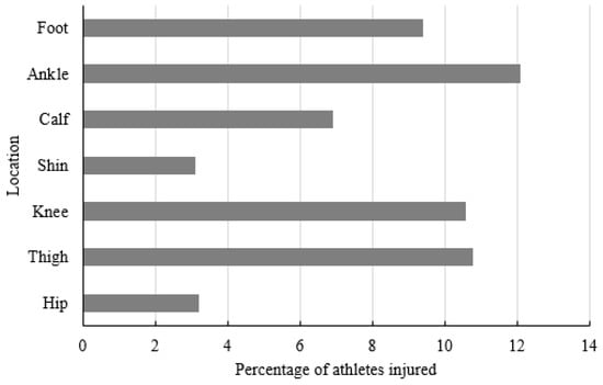 A total of 2294 questionnaires were submitted. Any response was excluded if there was no response for the question of presence or absence of injury. Data from 2269 questionnaires were included in the final analyses. From these responses, 750 athletes (33.1%) specialized in laterally dominant sports (tennis, table tennis, soccer, badminton, fencing, long jump, shot put, high jump, baseball, and softball), and 1519 athletes (66.9%) specialized in non-laterally dominant sports (swimming, running, cycling, skating, basketball, taekwondo, rope skipping, dance, hockey, volleyball, traditional martial art, judo, kickboxing, karate, roller skating, gymnastics, and boxing). A total of 576 (25.4%) athletes sustained non-contact lower-limb injury causing time loss (≥1 day) from participation in sport activities during the preceding 12 months. The ankle (12.1%), thigh (10.8%), and knee (10.6%) were most commonly reported as the location of injury (Figure 1). Ligament sprain (15.7%) and muscle strain (8.5%) were the most commonly reported non-contact lower-limb injuries (Figure 2).