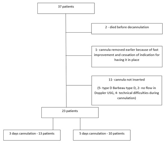 Thirty-seven patients were randomly assigned to either three or five days of radial artery cannulation. The patients’ flowchart is shown in Figure 1.