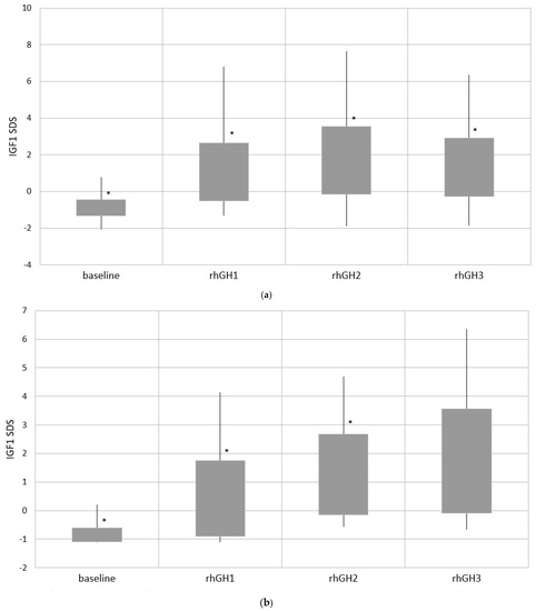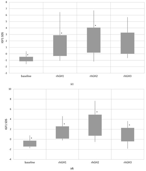 Insulin-like growth factor 1 (IGF1) SDS at baseline and during recombinant human growth hormone (rhGH) treatment. The bottom of the box indicates -1 SDS; the top of the box, +1 SDS; and the vertical lines, minimal and maximal values. * p < 0.05 for the mean values: rhGH1 vs. baseline, rhGH2 vs. rhGH1 and rhGH3 vs. rhGH2. (a) Whole cohort and (b) group 1: age ≤2 years of life; (c) group 2: age >2 and ≤4.5 years of life; (d) group 3: age >4.5 and ≤8 years of life; and (e) group 4: age >8 years of life.