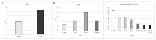 The age of patients who developed nosocomial infections ranged from 14 to 93 years. The mean age of hospitalized patients was 54 years. However, taking into account the division into sex, the age range for women was 46–93, with the mean age of 67 years. In the case of men, the age range was 14–86 years, and the mean was 48 years. In the case of the division of patients into age groups, in the first large group, nosocomial infections were detected in seven (14.29%) patients, while in the remaining groups, i.e., 30–49 years, 50–69 years and over 70 years, respectively in eleven (22.45%), twenty (40.82%), and eleven (22.45) NI (Figure 1).