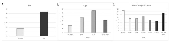 The number of patients diagnosed with nosocomial infections by sex (A), age (B) and time of hospitalization (C).