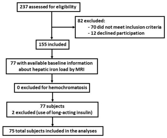 The original ongoing study involves 155 participants between 40 and 60 years, with a diagnosis of NAFLD by magnetic resonance imaging (MRI) with a BMI of 27–40 kg/m2, and meeting at least three of the five criteria of MetS as described in the International Diabetes Federation (IDF) consensus [22]. Exclusion criteria were previous cardiovascular disease, congestive heart failure, liver diseases (other than NAFLD), cancer or a history of malignancy in the previous 5 years, previous bariatric surgery, acute febrile illnesses, urinary tract infections, post-renal hematuria, hemochromatosis, protein overload, non-medicated depression or anxiety, alcohol and drug abuse, pregnancy, primary endocrinological diseases (other than hypothyroidism), concomitant therapy with steroids, intense physical exercise, or being unable to provide informed consent. At inclusion, all participants had a stable body weight and caloric intake during the previous six months. The current cross-sectional secondary analysis used a subset of 77 participants within the original study, with available data on hepatic iron load by MRI. Patients’ clinical histories were further revised to exclude patients with hereditary or acquired hemochromatosis or hemosiderosis. Screening and selection criteria for study inclusion are illustrated in the study flow-chart (Figure 1).
