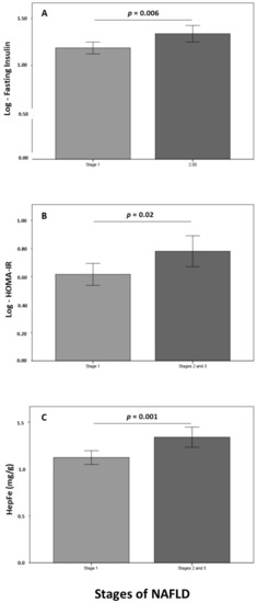 Differences in fasting insulin (A), HOMA-IR (B), and HepFe (C) between stage 1 and stages 2 and 3 of NAFLD.
